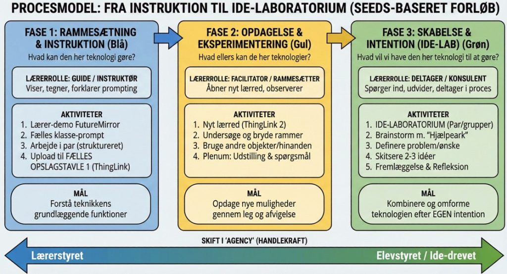 I følgende afsnit, har vi valgt at redidaktisere vores forløb på DOKK1. Overvejelserne bag dette går på, at kunne overføre forløbet til et klasserum, da rummet på DOKK1 bar præg af et uformelt rum, hvor børn og voksne frivilligt ”tappede” ind og ud af processen. Skal forløbet rammesættes, må man gå ud fra, at målgruppen deltager aktivt. Vi vil altså udarbejde en skitse, som gør det muligt at omdanne et formelt rum til et uformelt, legende og kreativt rum. Vi har i det følgende taget udgangspunkt i rammesætningen for SEEDS  pædagogikken, da denne danner ramme for digital leg og læring i en kreativ proces:
