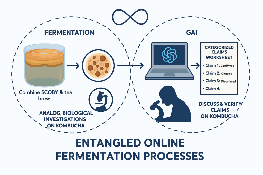 Den sammenflettede proces ses i det biologifaglige som tages videre, og dyrkes i en dialogisk læringsproces, hvor der er fokus på påstande omkring kombuchaens påvirkning på sundhed og velvære. Disse påstande afprøves ved hjælp af GAI og opsummeres i fællesskab, hvor disse således bliver genstand for debat og spørgsmål til videre arbejde med at ruste eleverne til en verden fyldt med påstande som både kan være sande og usande.