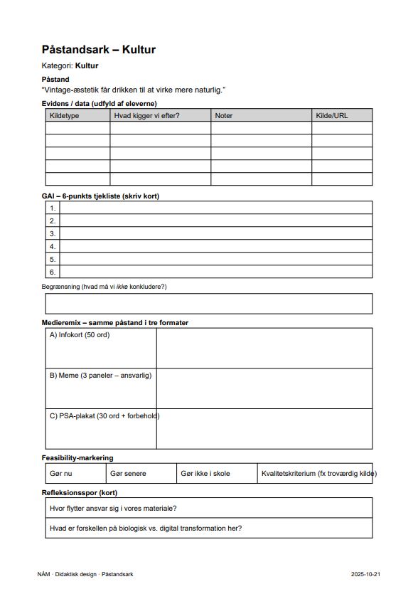 I forhold til Dalsgaard & Rybergs model bevæger forløbet sig mellem det producerende rum (påstande, ark, medieremix) og det refleksive rum (klassens diskussioner, etik, dømmekraft). GAI fungerer her som en kognitiv partner – ikke som facit, men som et spejl, der gør elevernes vurderinger synlige.