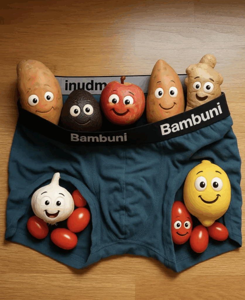 Vores refleksioner gik på at det kunne være sjovt at lave en musikvideo ud fra dette billede. Billedet gav os en vibe af glade grøntsager der havde det trygt og godt i et sæt underbukser.
