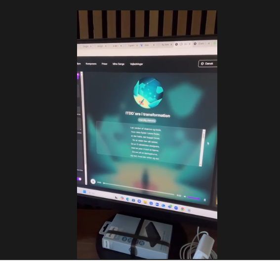 Vi var samtidig fanget af de sange der var lagt op hvor AIsonggenerator havde lavet en sang om bla. ITDD’ere i transformation. Vi lavede derfor et promt til gemini om en sangtekst, og satte sangen ind i AIsonggenerator. Resultatet er her: