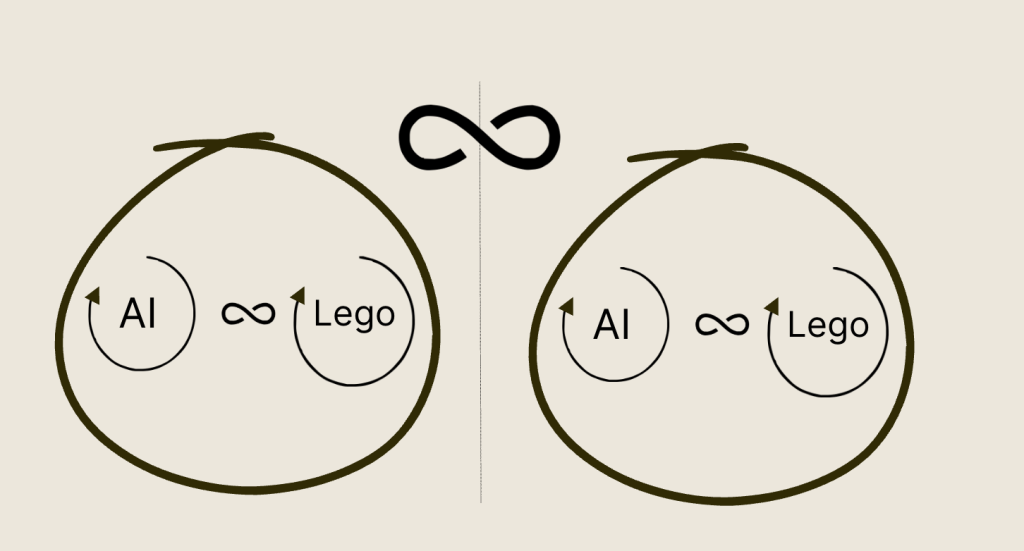 den anden er slutbilledet i børnehaven. jeg ville gerne vide mere om de processer, der foregår her – for det ser komplekst ud. billeder, prompts og legofigurer er altsammen under produktion, i leg – samtidig. Det er vel her den nye viden ligger – som den også er antydet i jeres video med Uganda.